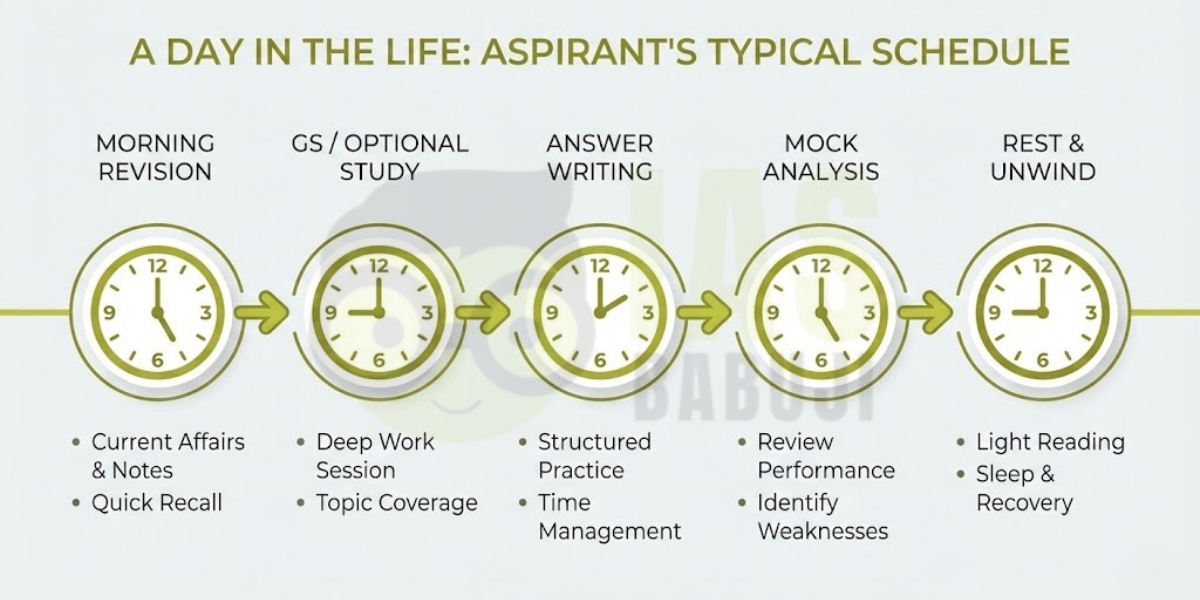 - Midday (4–5 hrs): GS or Optional subject