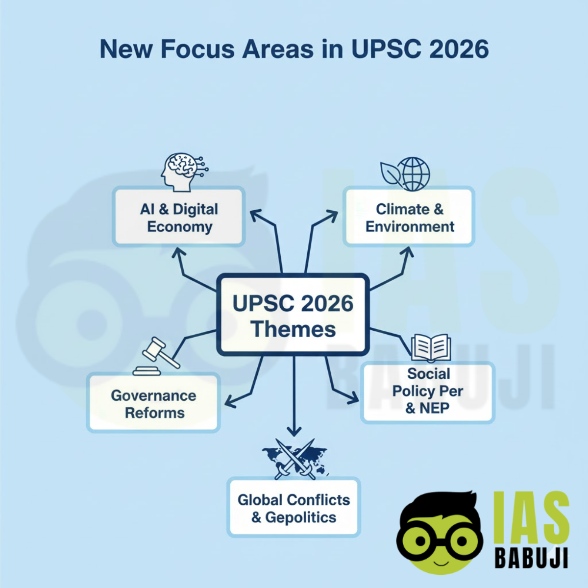 As of now, UPSC has not released any official notification indicating a radical change in the syllabus or pattern for CSE 2026; standard Prelims and Mains syllabi remain applicable. However, within this framework, emerging themes feature more prominently in questions and must be treated as “new focus areas” during preparation.