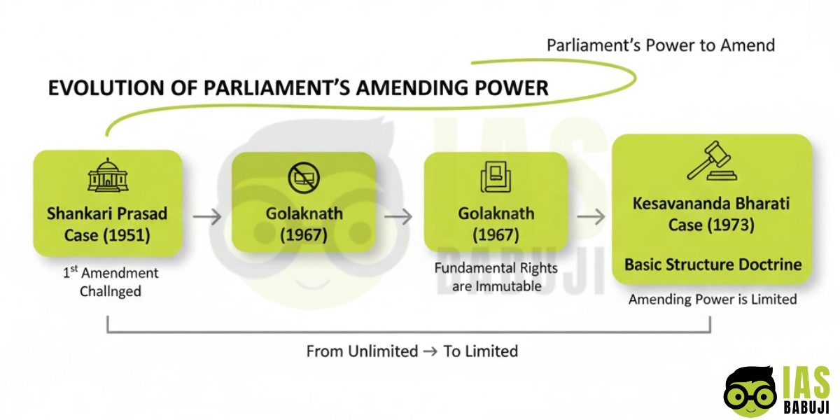 A flowchart infographic showing Shankari Prasad → Golaknath → Kesavananda Bharati. Minimal icons, UPSC revision-friendly layout, color accent #b3c839.