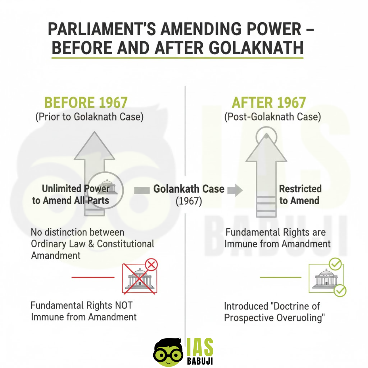 A split comparison infographic showing Parliament’s unlimited amending power before 1967 versus restricted power after Golaknath judgment. Clean academic vector style, white background, accent color #b3c839.