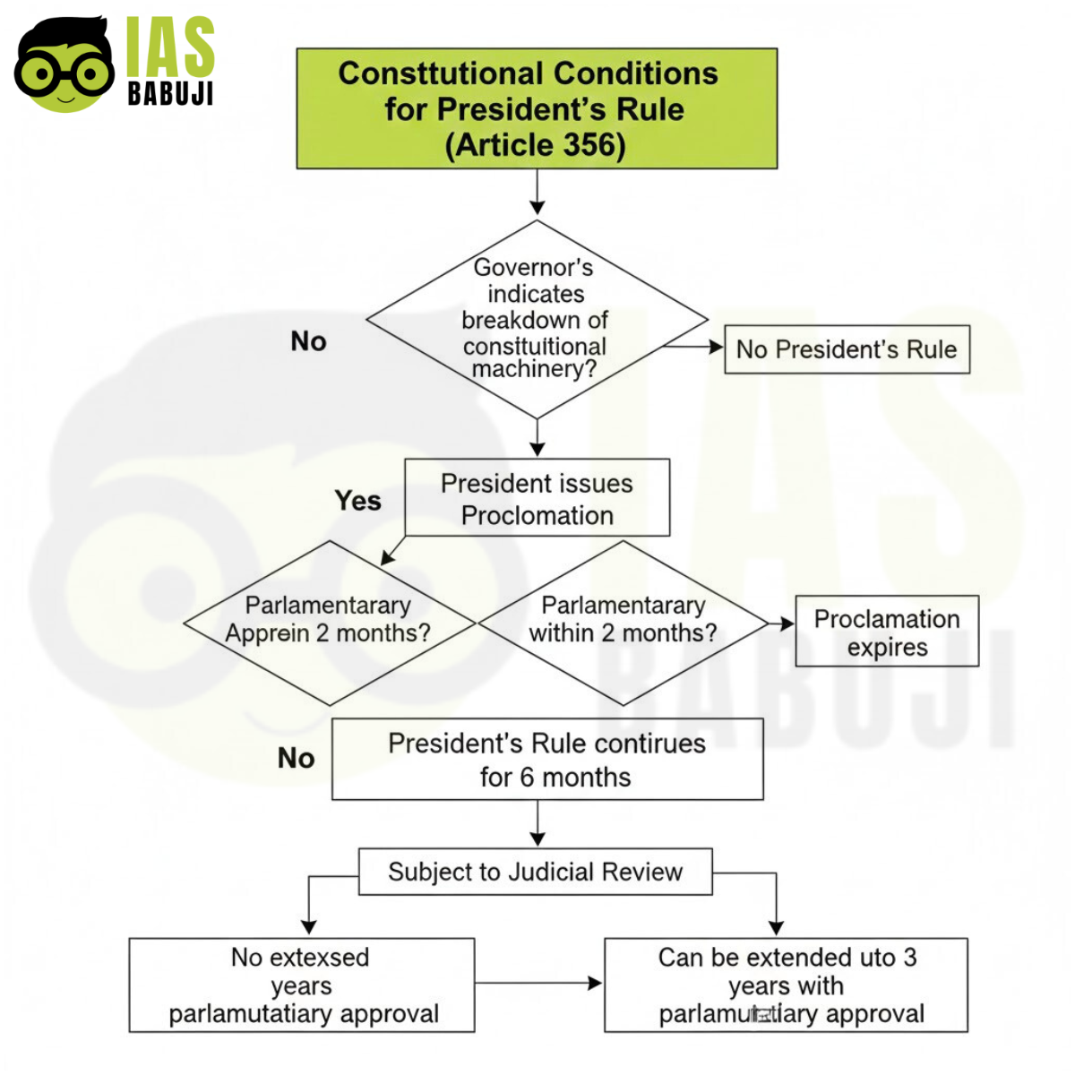 Flowchart infographic showing constitutional conditions for President’s Rule, including Governor’s report, floor test, and judicial review. Clean academic style, white background, accent color #b3c839.