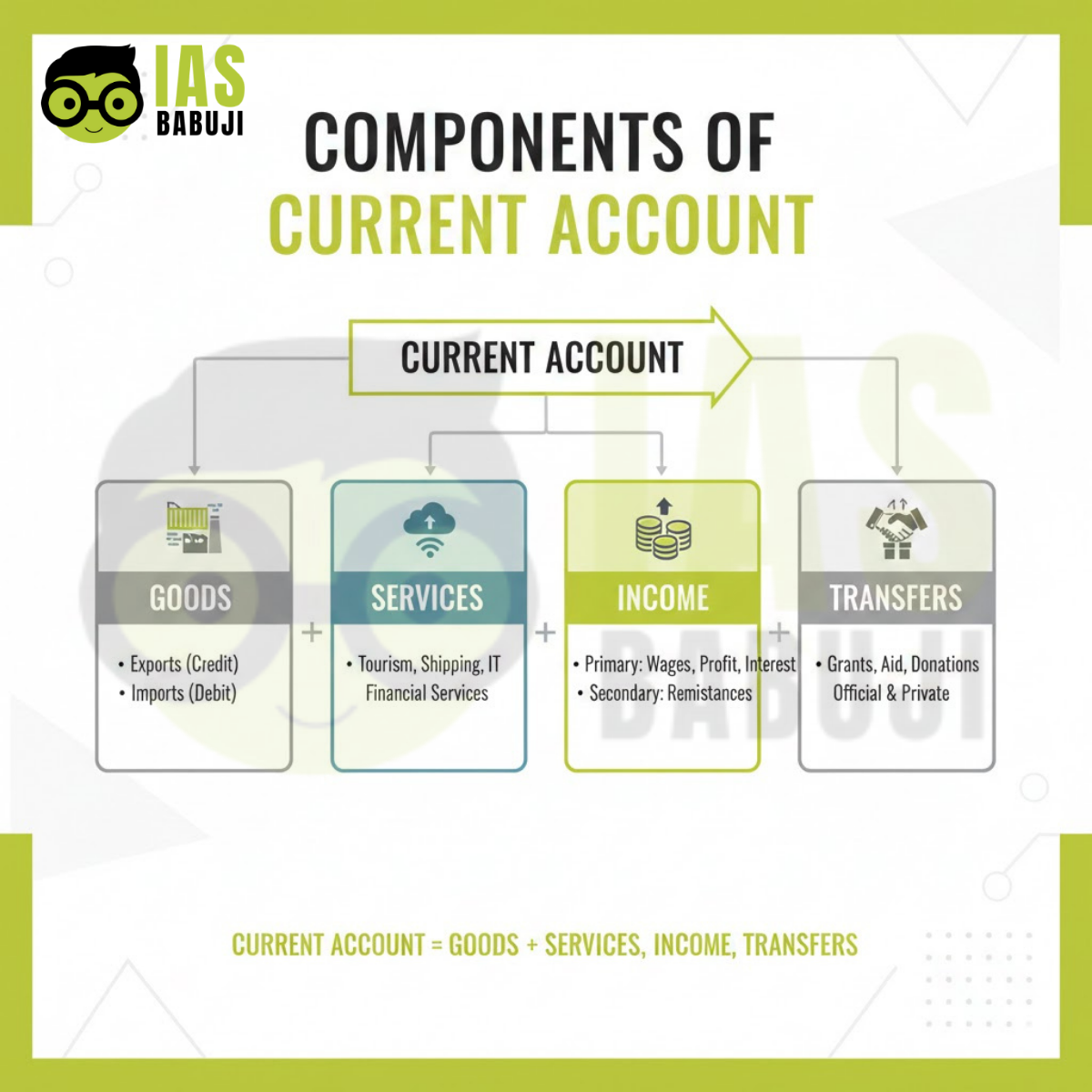 “Clean infographic explaining components of current account including goods, services, income, and transfers, exam-oriented layout, color theme #b3c839”