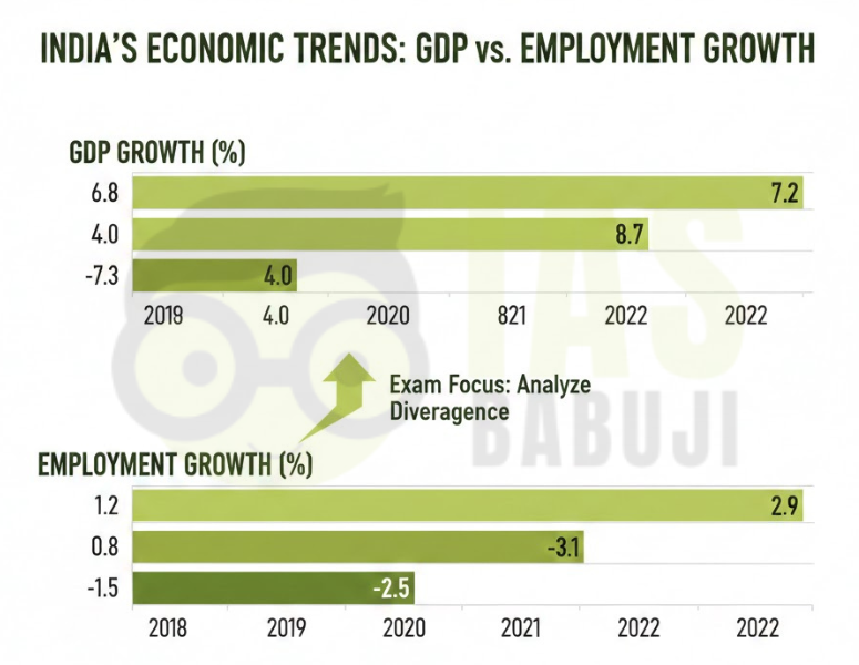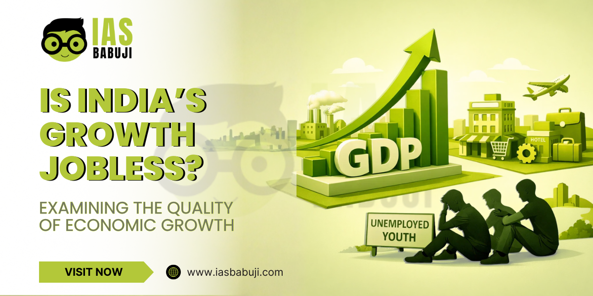 Economic growth is often measured through rising GDP numbers, but growth without adequate employment generation raises serious concerns for a labour-abundant country like India. Over the years, India has recorded phases of high economic growth alongside persistent unemployment and underemployment. This paradox has given rise to the debate on “jobless growth”, questioning the quality, inclusiveness, and sustainability of India’s development trajectory. For UPSC aspirants, this topic is highly relevant for GS Paper III, Essay, and Ethics, as it links growth with social justice, demographic dividend, and governance outcomes.