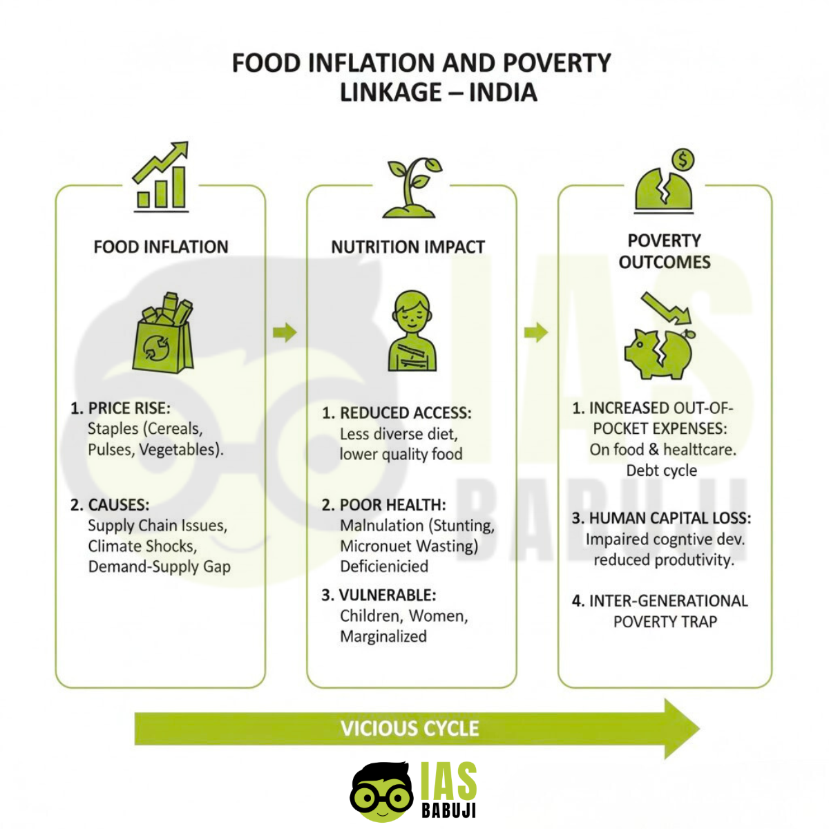 “Infographic explaining linkage between food inflation, nutrition, and poverty outcomes in India, minimal design, UPSC GS III style, color #b3c839”